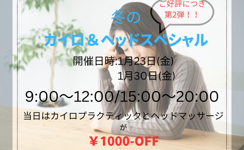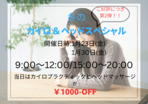 好評につき第2弾、冬のカイロ&ヘッドマッサージスペシャルと題してイベントを開催します!! ぎっくり腰やぎっくり背中の予防や また日常生活の疲労の蓄積から睡眠の質の低下改善に最適です。 この機会にぜひ体験してみてください(^^)